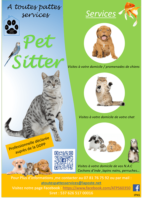 Micro-entreprise créée en 2020 et représentée par Emmanuelle Guézou (E I ), pet -sitter professionnelle, SIRET: 537 626 517 00016 et déclarée auprès de la Direction Départementale de la Protection des Populations.